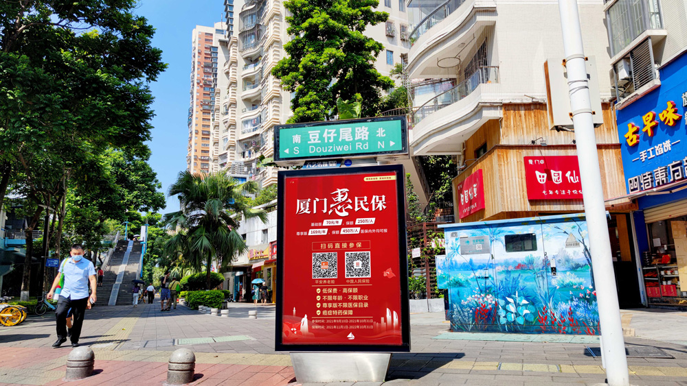 路牌及候車亭廣告畫面以“廈門惠民保”的四大優(yōu)勢以及參保二維碼(平安養(yǎng)老險、中國人民保險)為主進行宣傳,讓廈門人民在抗疫期間,多一份保障也多一份安心的守護。