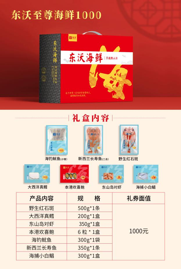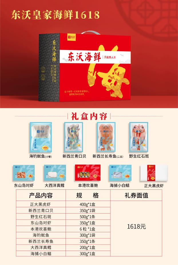 東沃海鮮盛宴禮盒魚、參、鮑、蝦滿滿一盒,將所有極具新年氛圍感、品質(zhì)高級感的海鮮,將所有對團圓的期盼、對新年的祝福都融入其中。