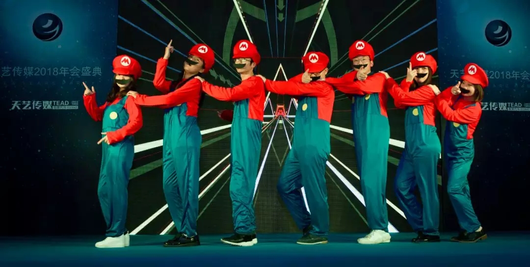 舞臺燈光驟然熄滅,再次點亮時,一群紅帽紅衣戴著大胡子的馬里奧“叔叔”出現(xiàn)啦!